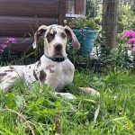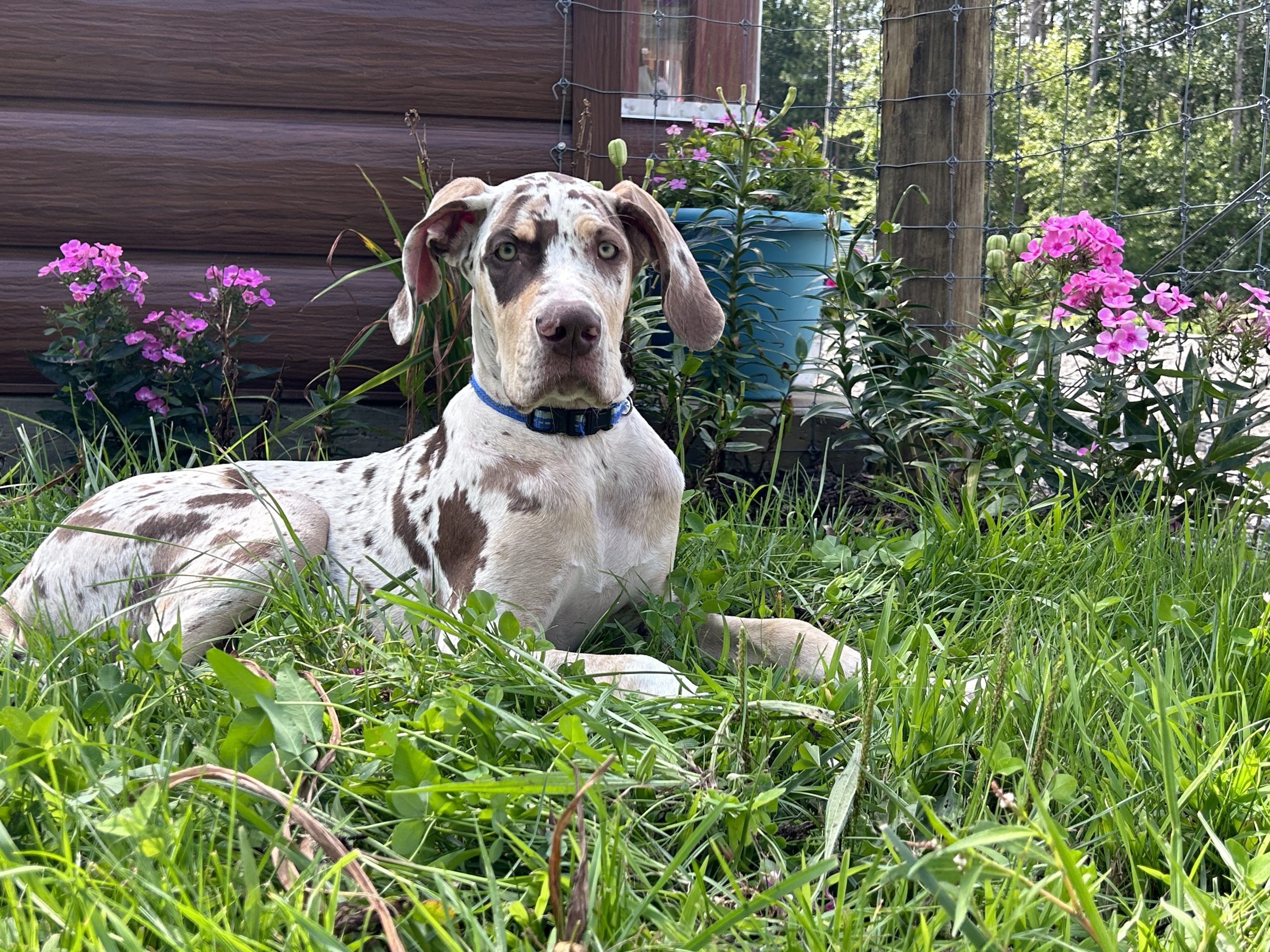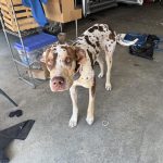Remi is a handsome Chocolate Harlequin Tanpoint! He has developed into a very tall and lean sire! He loves to run… his favorite is sprinting back-and-forth along our 100ft long chicken run! He also loves to follow us when we go on ranger rides on our property! Covering a few miles is no problem for this guy! He is also very well tempered. Goes with the flow and is by far the easiest going of all our dogs! He also is insanely smart. When we try to lock him outside the house, he always finds a way in, weather it be by finding an unlocked door and opening it or sneaking through the doggy door! He is a ball of fun and we are looking forward to all he brings to Ferguson Family Danes!